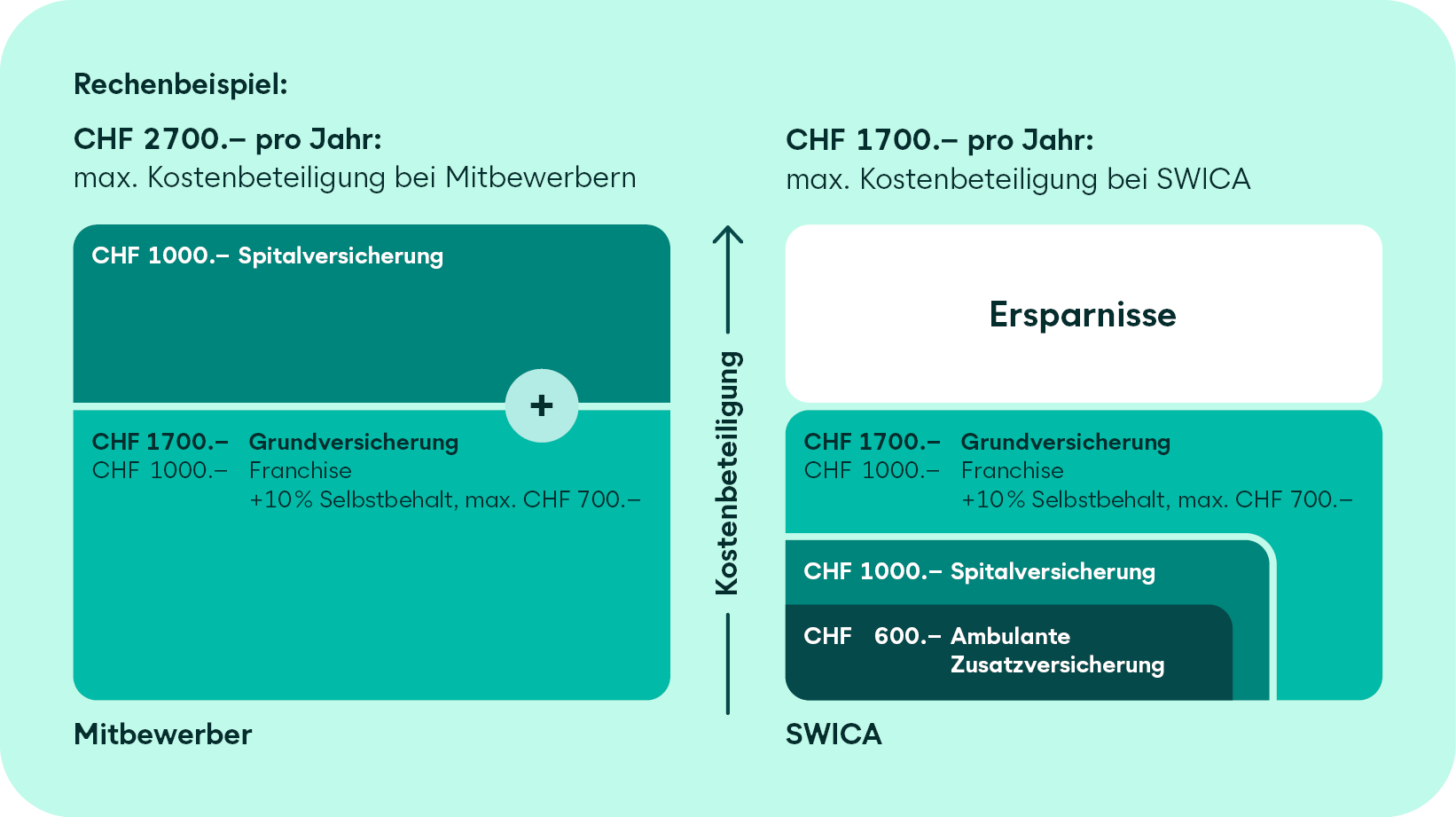 SWICA rechnet als einzige Krankenversicherung die Kostenbeteiligung ihrer Grundversicherung an die der SWICA-Zusatzversicherungen an, wodurch die maximale jährliche Kostenbeteiligung im Vergleich zu anderen Krankenversicherern grundsätzlich tiefer liegt.