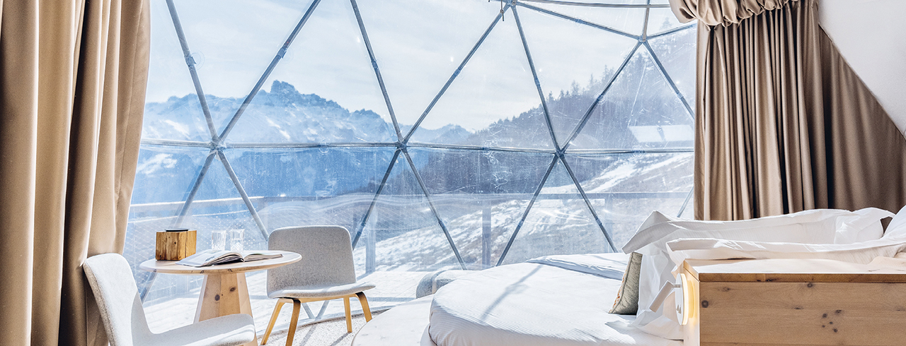Eingebettet in die Kulisse der Berggipfel bieten futuristische Hightechkuppeln ein unvergleichliches Panorama mitten in der Natur: In der aussergewöhnlichen Unterkunft erleben Sie eine Verschmelzung von Natur und Komfort fernab des Alltäglichen. Hier wird jeder Moment zum Erlebnis. Daneben sorgen Sauna, Wellnessbereich und die authentische Küche in der Brasserie für pure Entspannung.