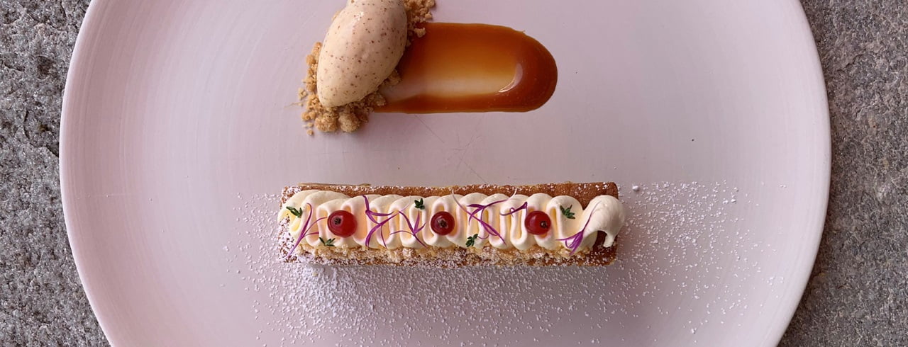 Apfelkuchen mit luftiger Haube, Vanille-Doppelrahm und braunem Mandeleis