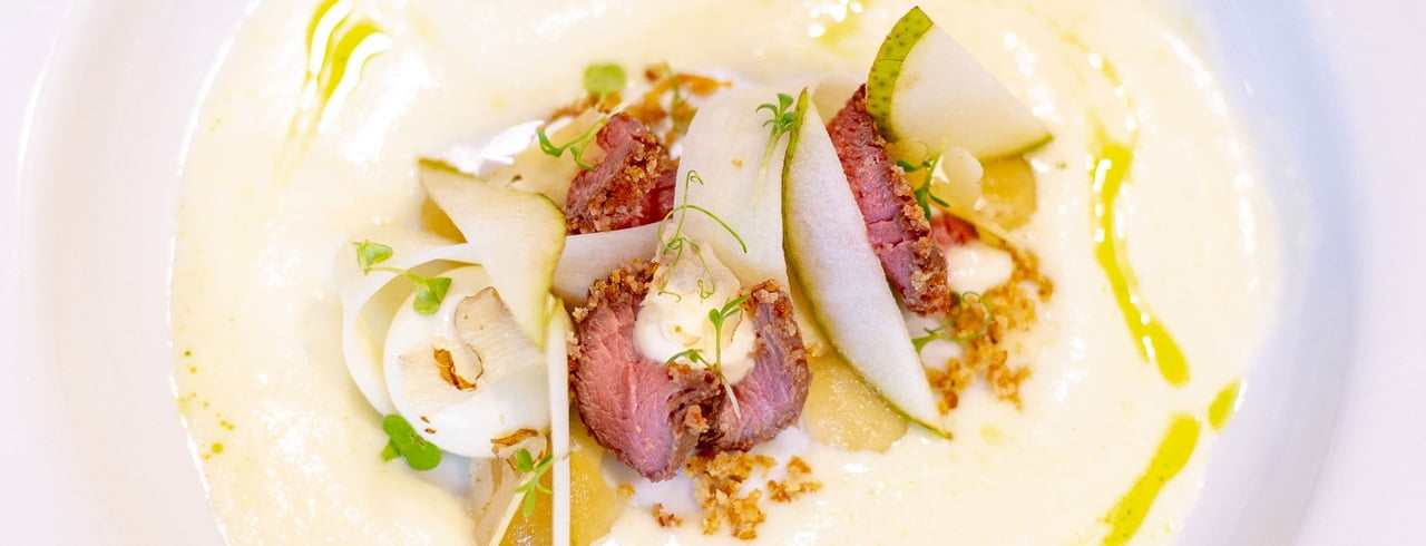 Pastinakenschaumsuppe mit Hirsch und Birne