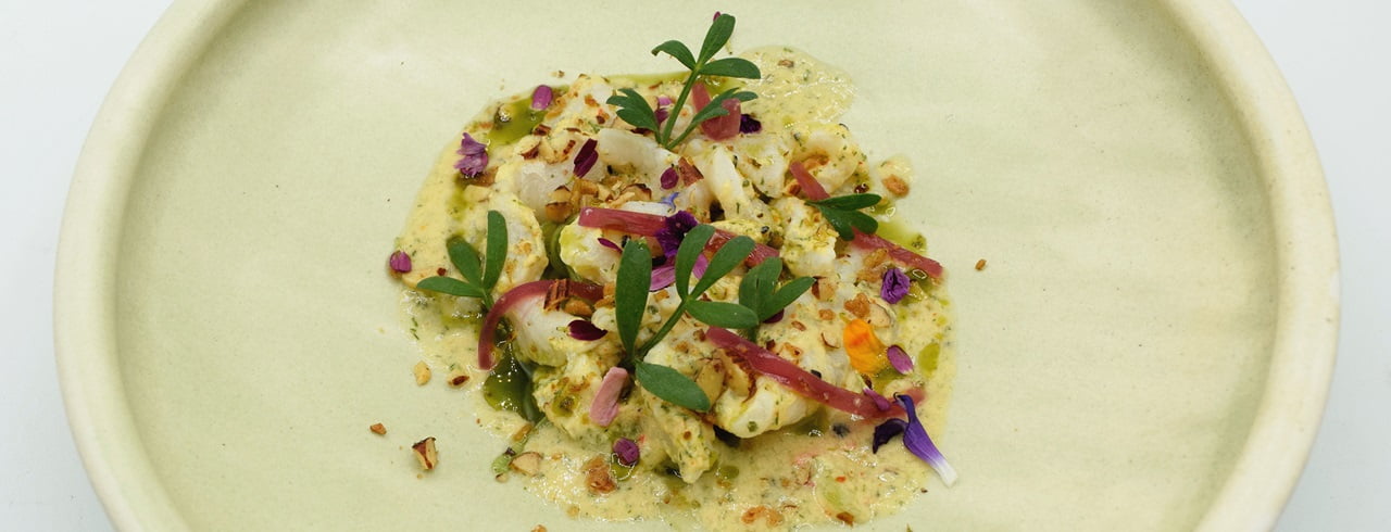 • Anrichten: Den Stangenselleriesalat in einem tiefen Teller in der Mitte positionieren, die Zanderscheiben verteilen (ca. 100g p.P.). Ein paar Streifen der gepickelten Zwiebeln darauflegen. Mit den grob gehackten Mandeln und ein paar frischen Kräuter ausgarnieren und mit etwas Olivenöl das Gericht abrunden.