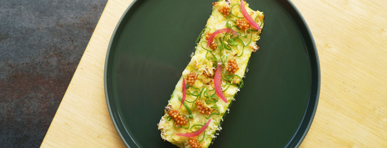 Sbrinz über die noch warmen Zucchetti raffeln, anschließend Senfkörner und Zwiebel-Spickel auf den Zucchetti anrichten. Am Schluss Zitronenschale über das fertige Gericht raffeln.