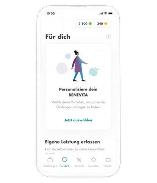 Oft bleibt wenig Zeit für Entspannung, ausgewogene Ernährung und Bewegung. Die Benevita-App motiviert Sie mit spannenden Challenges zu regelmässiger Bewegung, gesunder Ernährung und mehr Entspannung. Beantworten Sie ein Quiz, kochen Sie ein gesundes Rezept, machen Sie mit bei einer Morgenmeditation oder binden Sie Ihren Fitness-Tracker an, um Punkte zu sammeln.