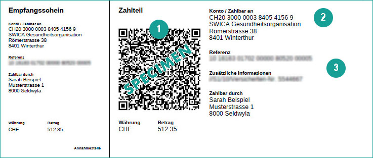 Bei Zahlungen aus dem Ausland funktioniert die auf der Prämienrechnung aufgedruckte QR-IBAN nicht. Stattdessen können Sie die über der QR-Rechnung angegebenen Zahlungsinformationen verwenden. Alternativ können Zahlungen aus dem Ausland auch mit dem Vermerk der Versicherten- und Abrechnungsnummer auf die folgenden Angaben erfolgen: