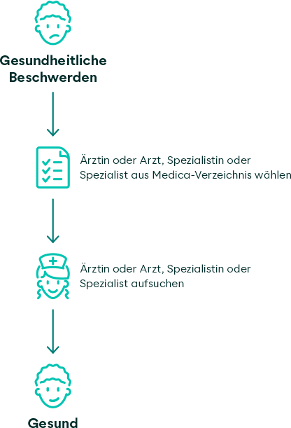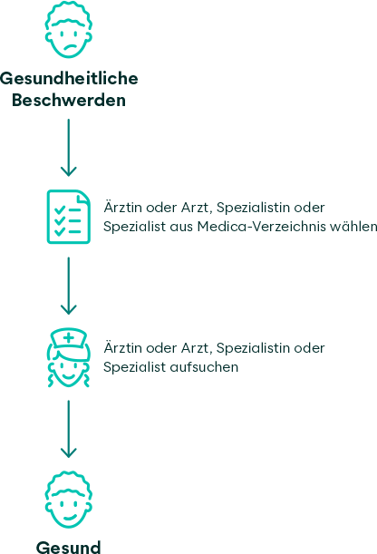 Mit dem Ärztelistenmodell Favorit Medica können Sie Ihre Ärztin oder Ihren Arzt jederzeit aus dem umfangreichen Medica-Verzeichnis frei wählen. Daneben steht Ihnen die Onlinepraxis santé24 unter der Telefonnummer +41 44 404 86 86 zur Verfügung.