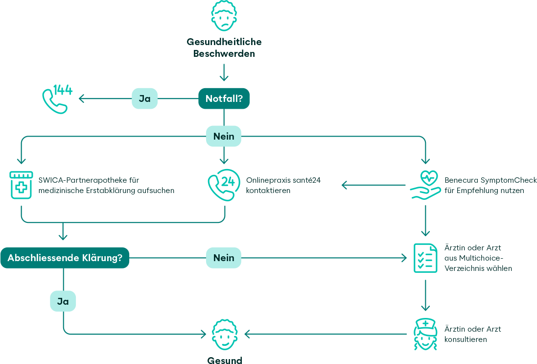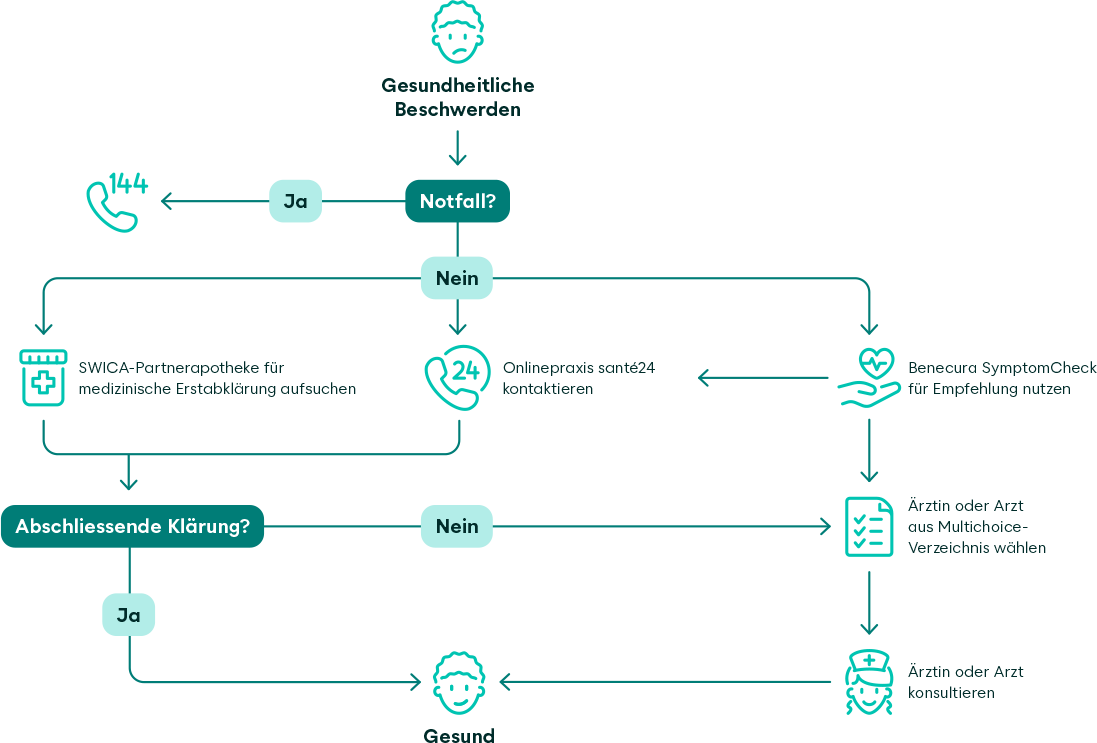 - Rasche medizinische Erstabklärung durch den SymptomCheck von Benecura, die Onlinepraxis santé24 oder eine SWICA-Partnerapotheke