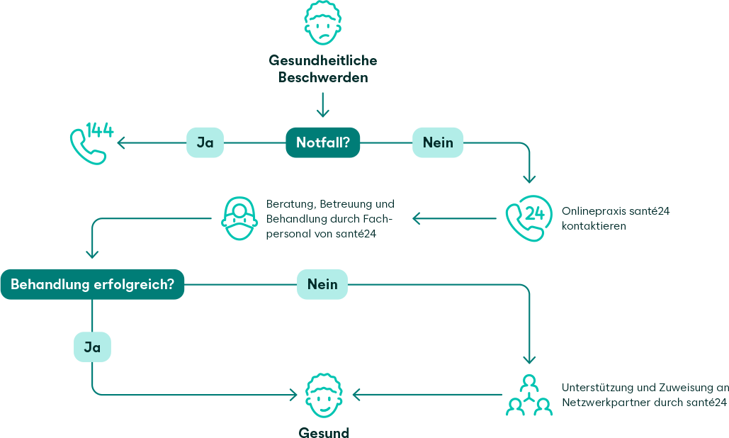 - Ab dem 1. Januar 2026 ohne Kostenbeteiligung (Ihre Franchise und Selbstbehalt bleiben unangetastet): Für sämtliche durch santé24 erbrachten telemedizinischen Leistungen (Beratungen, Konsultationen durch Fachpersonen und Arztkonsultationen), sofern eine Kostenübernahme durch die Grundversicherung erfolgt. Ausgenommen davon: Beratungen und Konsultationen in Zusammenhang mit einer Ernährungsberatung sowie die psychologisch-psychiatrische Sprechstunde.