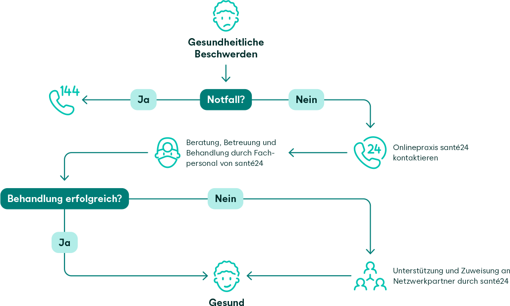 Mit dem Telemedizin-Modell Favorit Telmed rufen Sie bei jedem neu auftretenden Gesundheitsproblem vor einem Arzt- oder Spitalbesuch die Onlinepraxis santé24 unter der Telefonnummer +41 44 404 86 86 an. Die Ärztinnen und Ärzte sowie das medizinische Fachpersonal von santé24 stehen Ihnen rund um die Uhr zur Verfügung.