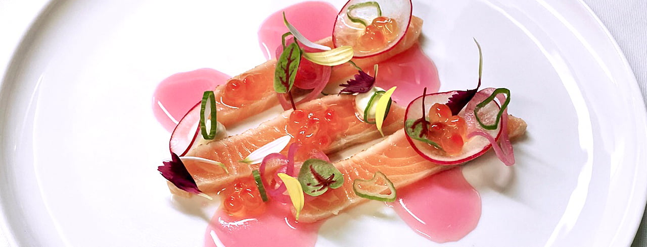 Dice the peeled red onions and mix with the remaining ingredients (except for the spices and lemon) into a fine paste in a blender or other container. Add the zest of the lemon and mix the juice of the lemon with the spices. Place the salmon in a deep dish (e.g. a gratin dish) and pour the onion marinade over it. Cover and leave to marinate in the fridge for about 2-3 hours. Finely slice the remaining red onion. Bring the water, vinegar, sugar and spices to the boil, pour over the onions while hot and allow to infuse. After 2-3 hours, remove the salmon from the marinade, rinse well and pat dry. Strain the marinade through a fine sieve or coffee filter and season to taste. Drain the red onions and slice the radishes and the spring onions. Use a sharp knife to carve the salmon into thin slices.