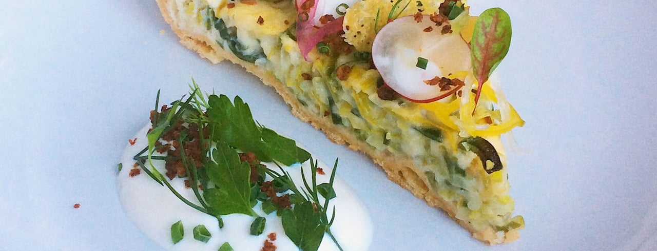 Cut the quiche into equally sized pieces. Spread all the other ingredients except the crème fraîche onto the quiche and garnish with the herbs.Place a portion of crème fraîche next to it on the plate. Bon appetit!