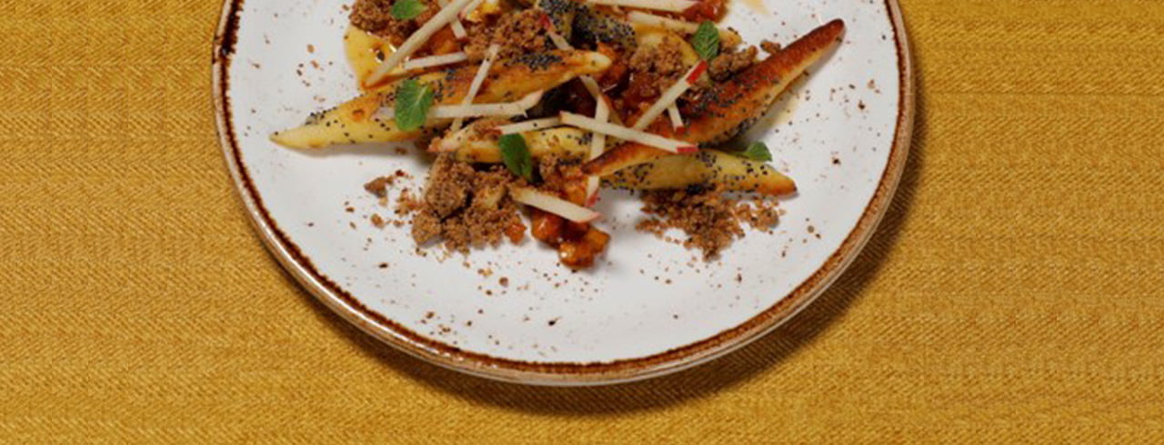 Arrange the seeded potato noodles on a long plate. Position the diced apple among them and sprinkle the crumbles on top. Garnish with apple blossom or herbs according to personal preference, and depending on the season.