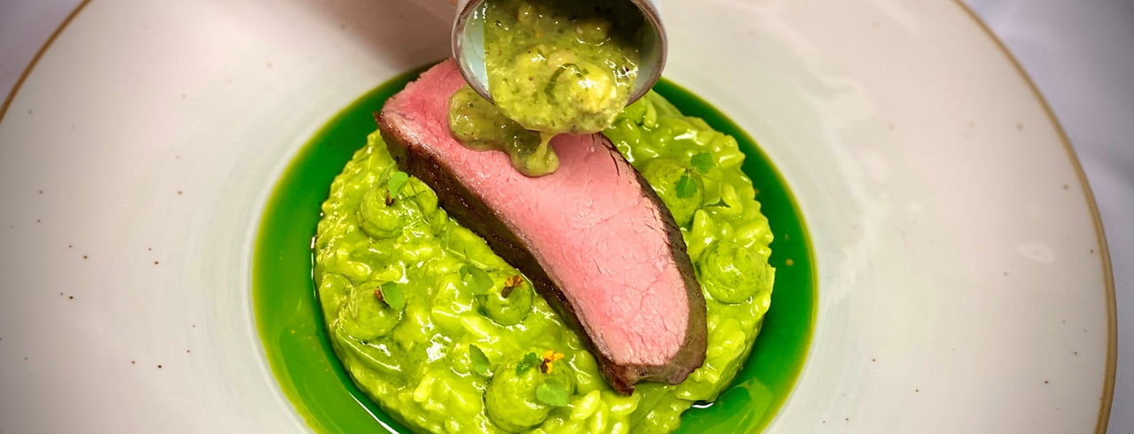 Finish cooking the risotto and add the runner beans before serving. Once the risotto has a good consistency with the cheese, oil and butter, serve it on a plate, ideally by forming a ring. Use the pea purée in the squeeze bottle to decorate the risotto with dots. Cut the meat into slices and place them on the risotto. Garnish the dish with the remaining herb oil and pour the vinaigrette over the meat in front of the guests (can also be prepared separately). You can also add some cress for decoration.