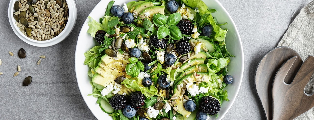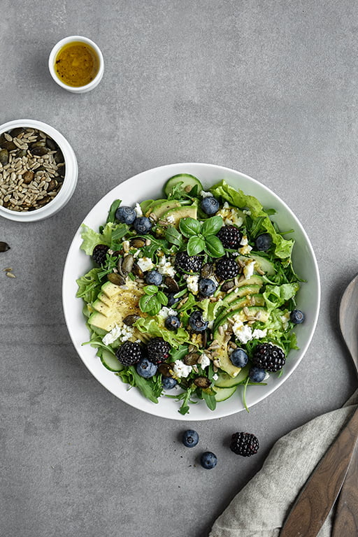 Wash the lettuce thoroughly, spin it dry and put it on a plate. Wash the cucumber (peel if necessary) and slice it. Remove the seed and peel of the avocado. Then cut it into strips. Spread the cucumber slices and avocado strips on the green salad. Crumble the feta over the salad by hand. Wash thoroughly and then drain and place the berries on top of the salad.