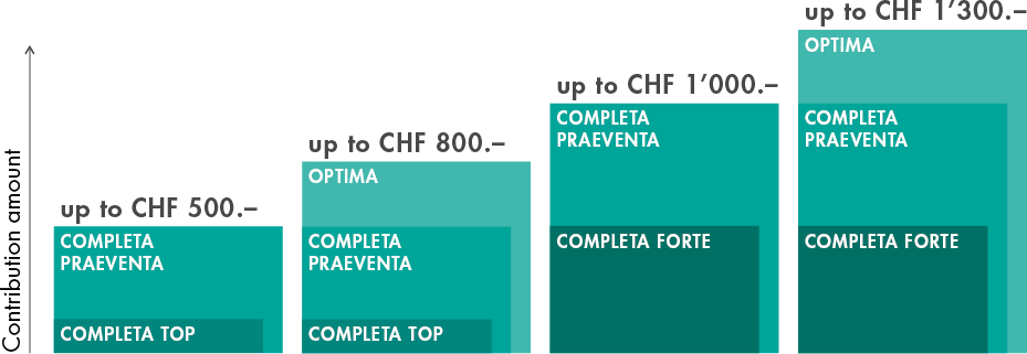 Benefit from generous contributions towards health-promoting activities. SWICA will contribute up to CHF 1'300* per year depending on your chosen supplementary insurance plans. Completa Praeventa can only be taken out in combination with Completa Top or Completa Forte.