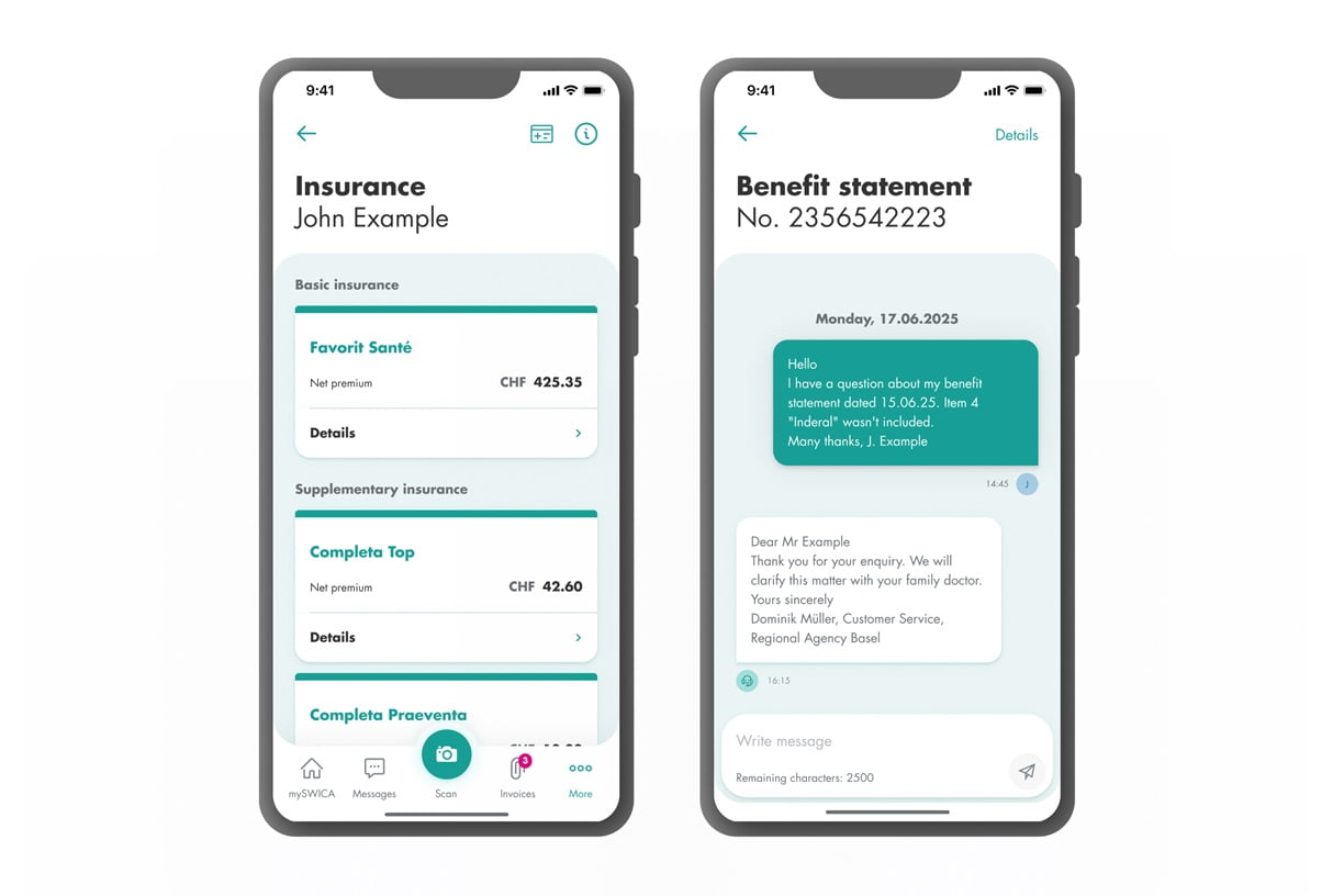 The mySWICAcustomer portal brings all the important information about your health insurance together in one place and is available both as a smartphone app and via your computer. It is available 24/7, enabling you to access your latest benefit/premium statements, submit invoices, view the balance on your excess, or contact SWICA customer services.