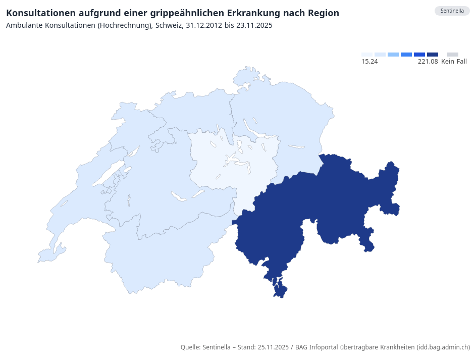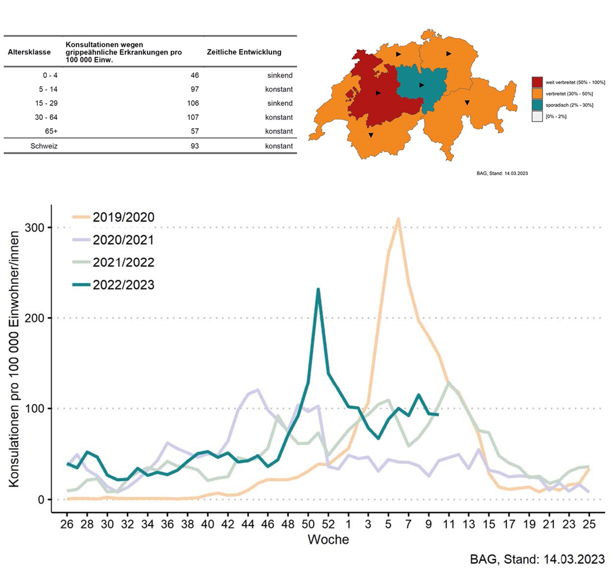 Les enfants de cinq à 14 ans, en particulier, ont été emmenés chez la ou le médecin en raison d’une infection grippale. Les personnes âgées de plus de 65 ans sont, en revanche, celles qui ont consulté le moins. Les consultations chez le médecin pour cause de maladie sont toujours très répandues dans la région des Grisons et du Tessin. La Suisse centrale, en revanche, n’est que peu touchée par la grippe.