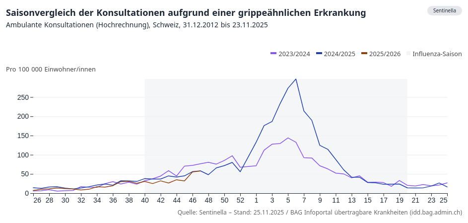 Après extrapolation à l’ensemble de la population suisse, 62 consultations médicales pour 100 000 habitantes et habitants avaient pour objet une suspicion de grippe au cours de la semaine écoulée. Le taux de consultation a donc diminué par rapport à celui de la semaine précédente. Sur une moyenne de trois semaines, la positivité à la grippe est de 26,4 % (semaine précédente: 18,1 %).