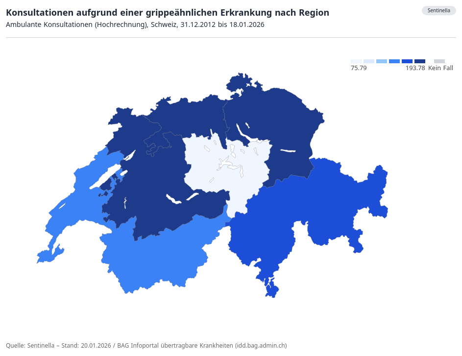 Les enfants de zéro à quatre ans, en particulier, ont été emmenés chez la ou le médecin en raison d’une infection grippale. Les personnes âgées de plus de 65 ans sont, en revanche, celles qui ont consulté le moins. Les consultations chez le médecin pour cause de maladie sont toujours très répandues dans la région des Grisons et du Tessin. La Suisse centrale, en revanche, n’est que peu touchée par la grippe.