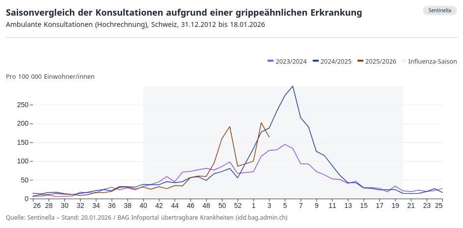 Après extrapolation à l’ensemble de la population suisse, on a enregistré la semaine dernière 164 consultations médicales liées à une suspicion de grippe pour 100 000 habitantes et habitants. Le taux de consultation est donc nettement inférieur à celui de la semaine précédente.