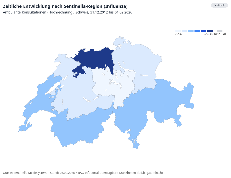 Les enfants de 0 à 4 ans, en particulier, ont été emmenés chez la ou le médecin en raison d’une infection grippale. Les personnes âgées de plus de 65 ans sont, en revanche, celles qui ont consulté le moins. La grippe touche en particulier les régions des Grisons et du Tessin. La Suisse centrale, en revanche, n’est que peu touchée par la grippe.