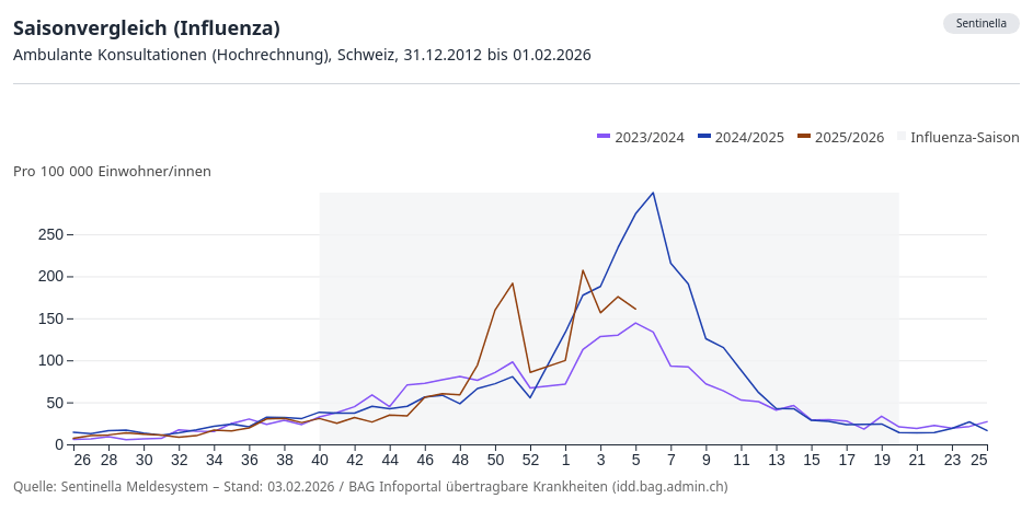 Après extrapolation à l’ensemble de la population suisse, on a enregistré la semaine dernière 179 consultations médicales liées à une suspicion de grippe pour 100 000 habitantes et habitants. Bien que le taux de consultation ait légèrement augmenté, le nombre de cas confirmés en laboratoire continue de diminuer.