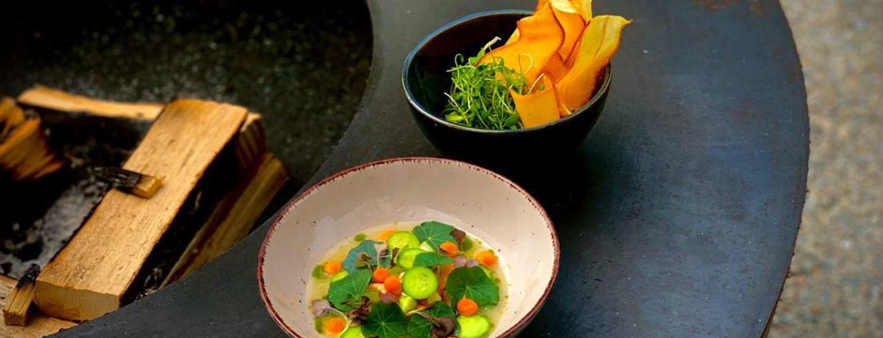 Répartir les dés de poisson dans des assiettes creuses. Ajouter quelques dés de tomates vertes du mélange fenouil-tomates. Arroser avec tout le jus et commencer à décorer. Décorer avec des lamelles de concombre, la purée d'avocat, des pétales de fleurs ou du cresson, arroser d'un filet d'huile. Servir le fenouil avec les chips de manioc à part.