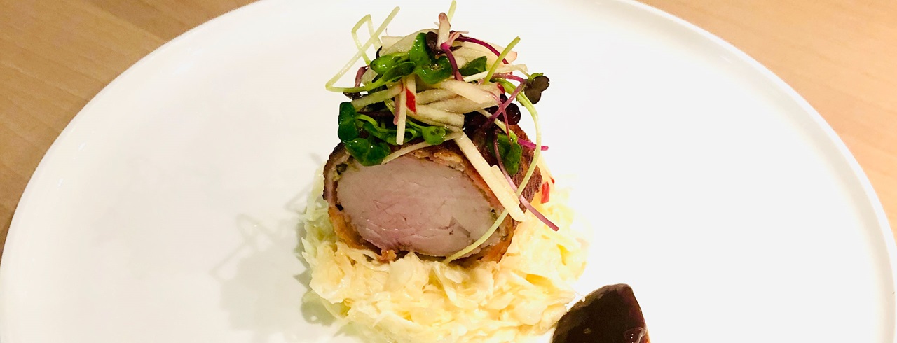 Filet de porc bardé de lard, salade de pomme aux herbes, choucroute, purée de pruneaux