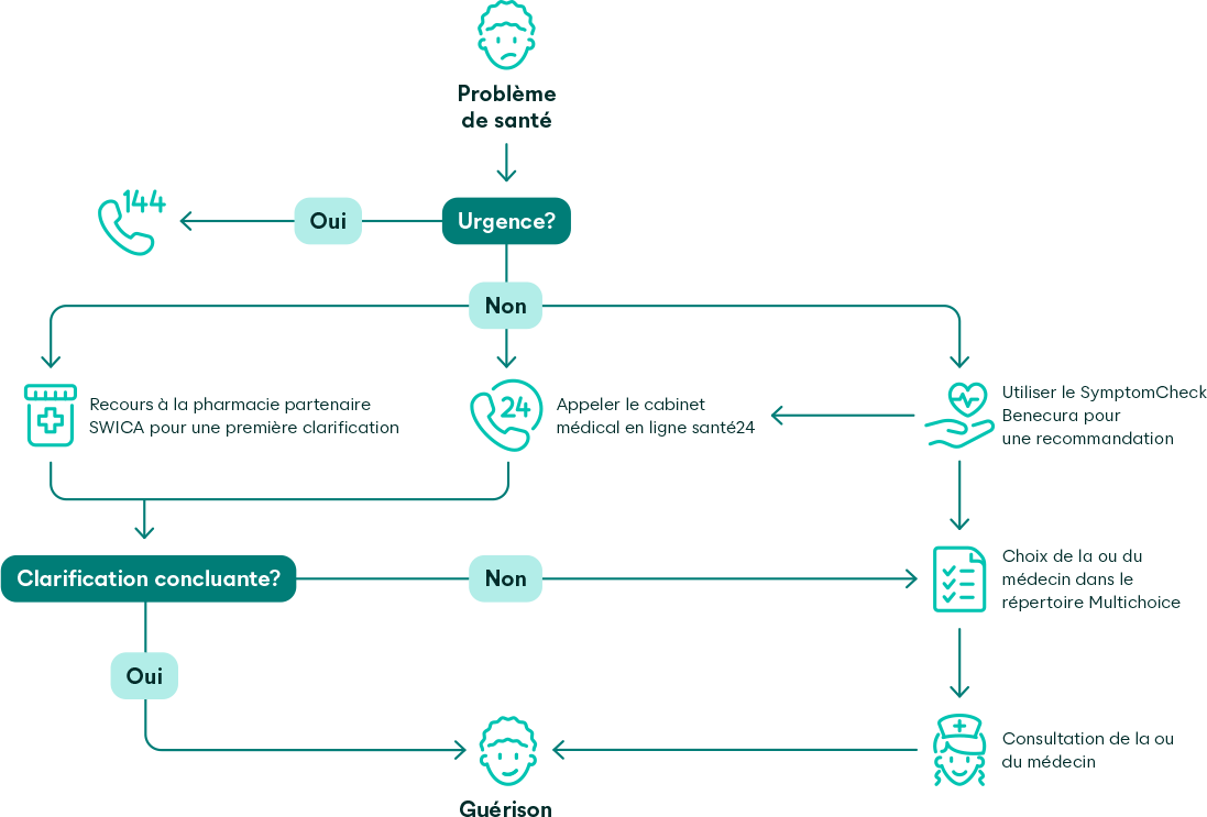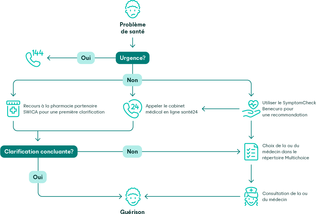 Dans le modèle Favorit Multichoice, vous utilisez le SymptomCheck de Benecura qui vous fournira une recommandation sur la marche à suivre en fonction de vos réponses. Vous pouvez aussi consulter le cabinet médical en ligne santé24 (disponible 24 heures sur 24) au +41 44 404 86 86 ou vous rendre dans l’une de nos pharmacies partenaires.