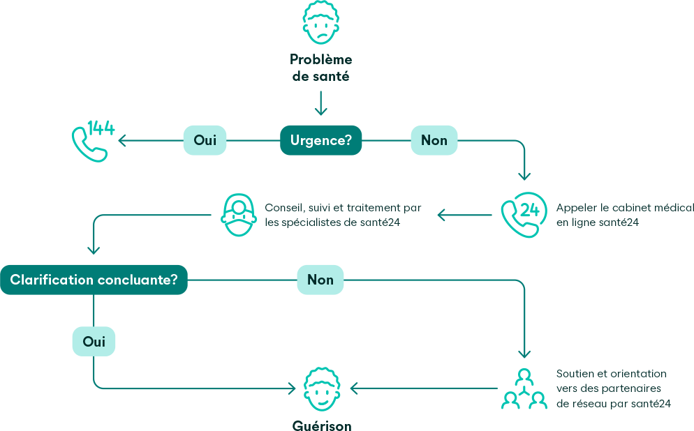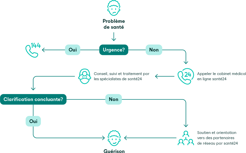 Dans le modèle de télémédecine Favorit Telmed, à chaque nouveau problème de santé, vous appelez le cabinet médical en ligne santé24 au +41 44 404 86 86 avant de vous rendre chez la ou le médecin ou à l’hôpital. Les médecins et les spécialistes de santé24 vous répondent 24 heures sur 24.