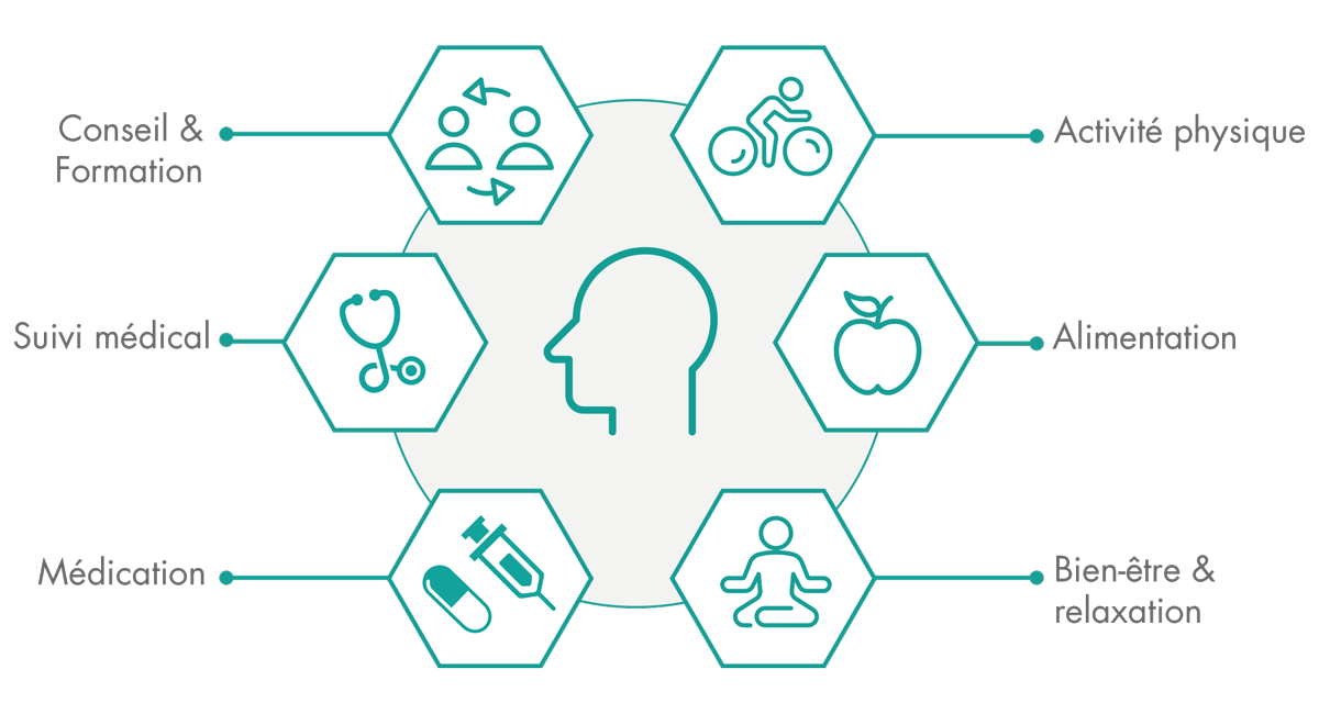 Hormis un suivi médical et personnalisé, les programmes de Disease Management comportent un plan de traitement adapté à vos besoins. Principe fondamental: vous attribuer un rôle actif au sein de l'équipe de traitement. Vous recevez des informations détaillées en matière d'alimentation, d'activité physique et de bien-être général.