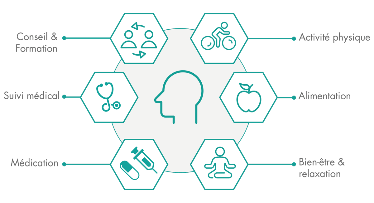 Hormis un suivi médical et personnalisé, les programmes de Disease Management comportent un plan de traitement adapté à vos besoins. Principe fondamental: vous attribuer un rôle actif au sein de l'équipe de traitement. Vous recevez des informations détaillées en matière d'alimentation, d'activité physique et de bien-être général.
