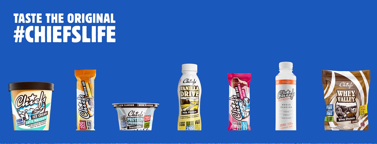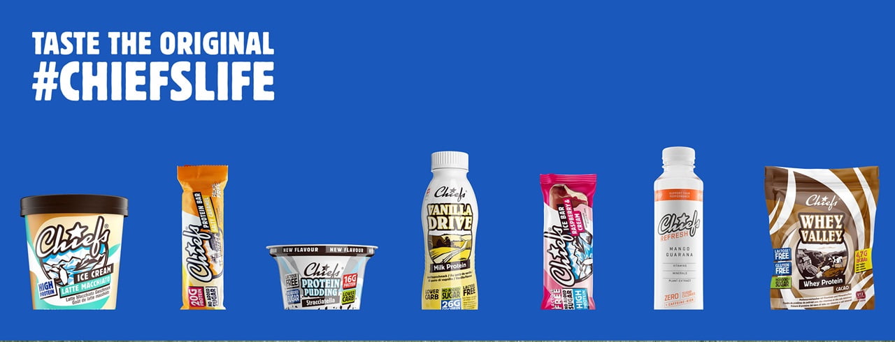 Chiefs ne propose pas que des Milk Protein Drinks, mais aussi une multitude d’autres aliments fonctionnels comme les Protein Bars, les Chiefs Puddings ou autres eaux vitaminées de la nouvelle ligne Chiefs Refresh.