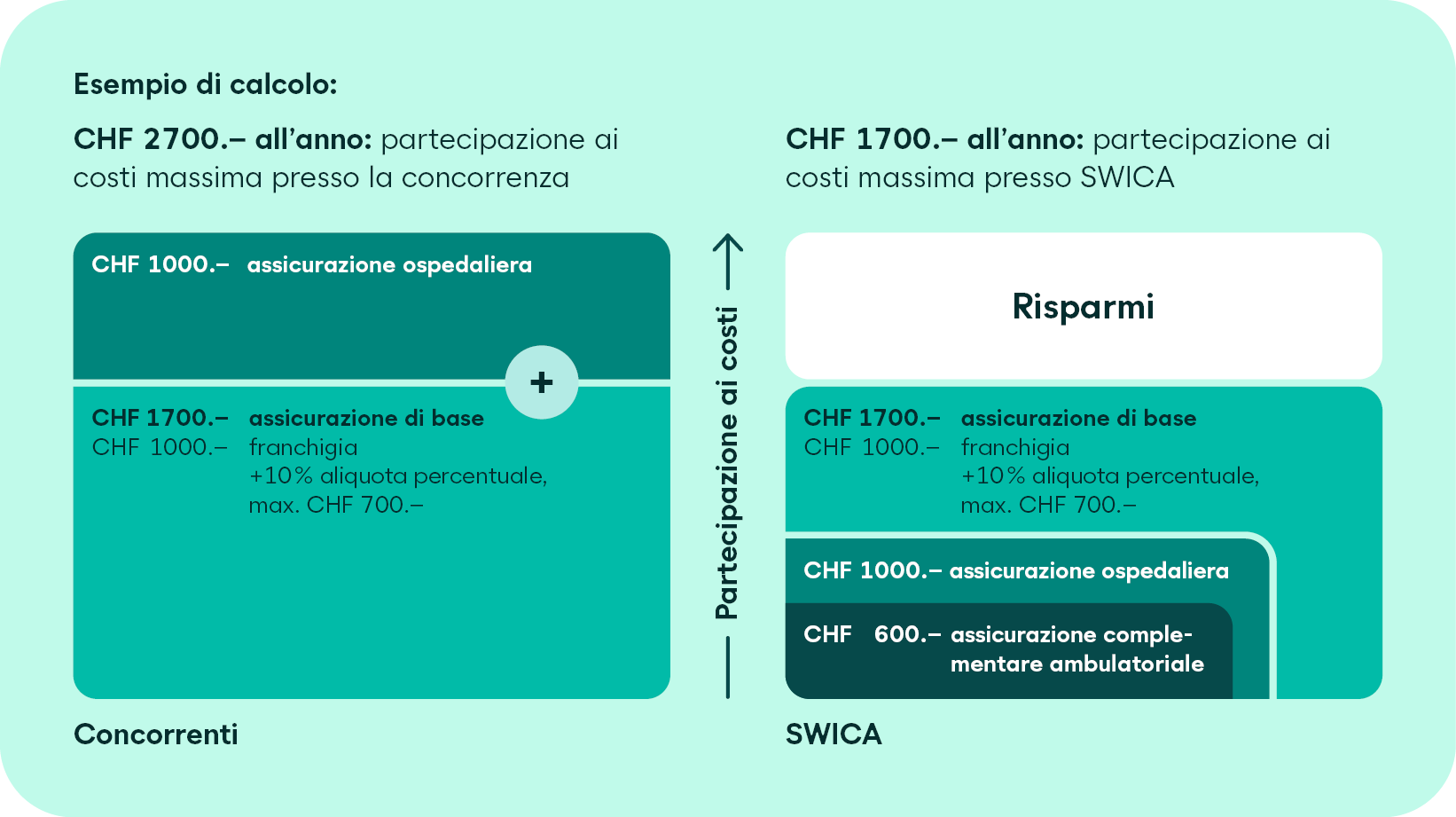 SWICA è l’unica assicurazione malattie in Svizzera a conteggiare la partecipazione ai costi dell’assicurazione di base con quella delle assicurazioni complementari. In tal modo la partecipazione ai costi annua massima è sensibilmente inferiore rispetto a quella applicata dagli altriassicuratori malattie.
