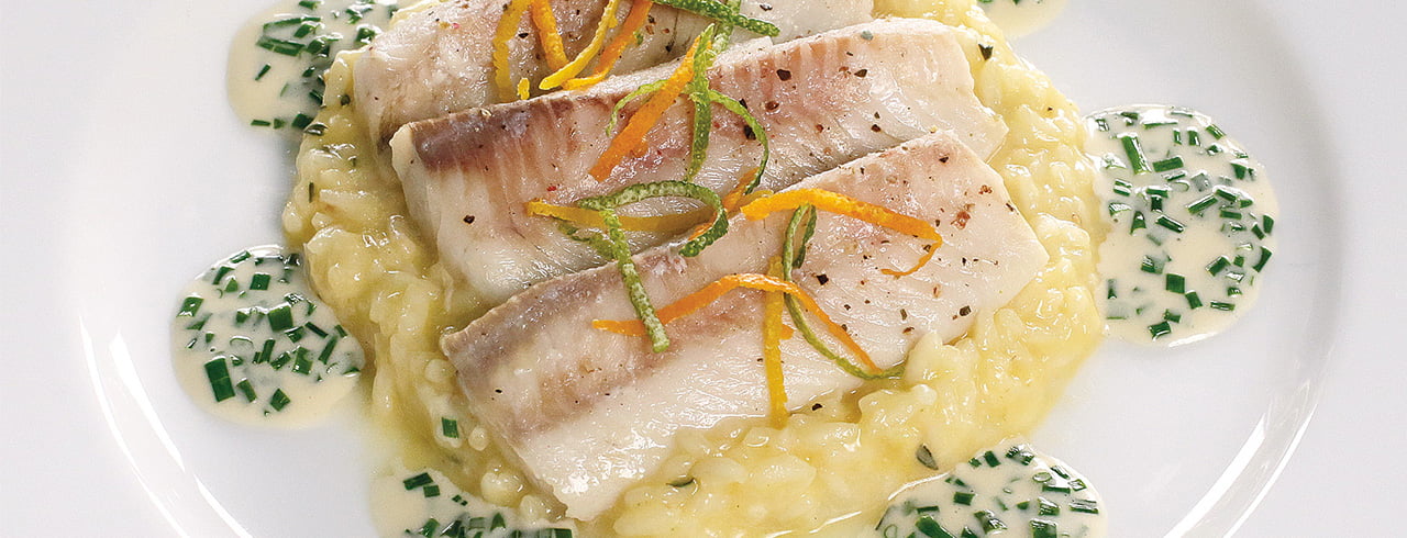 Pesce persico in crema di latte alla salvia con risotto all’arancia e lime