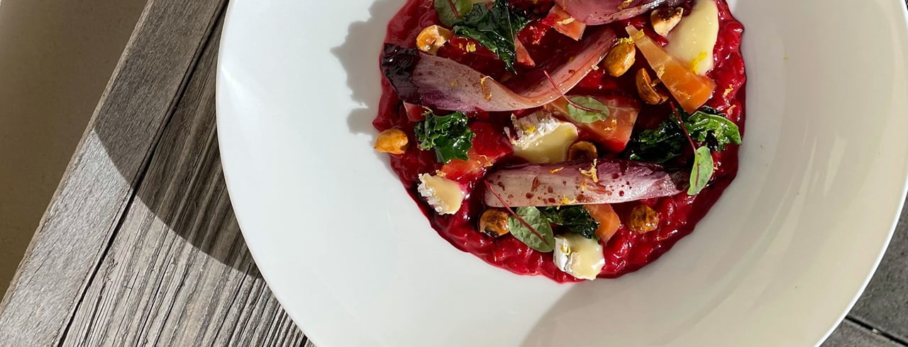 - Ripartire il risotto alla barbabietola su quattro piatti.
