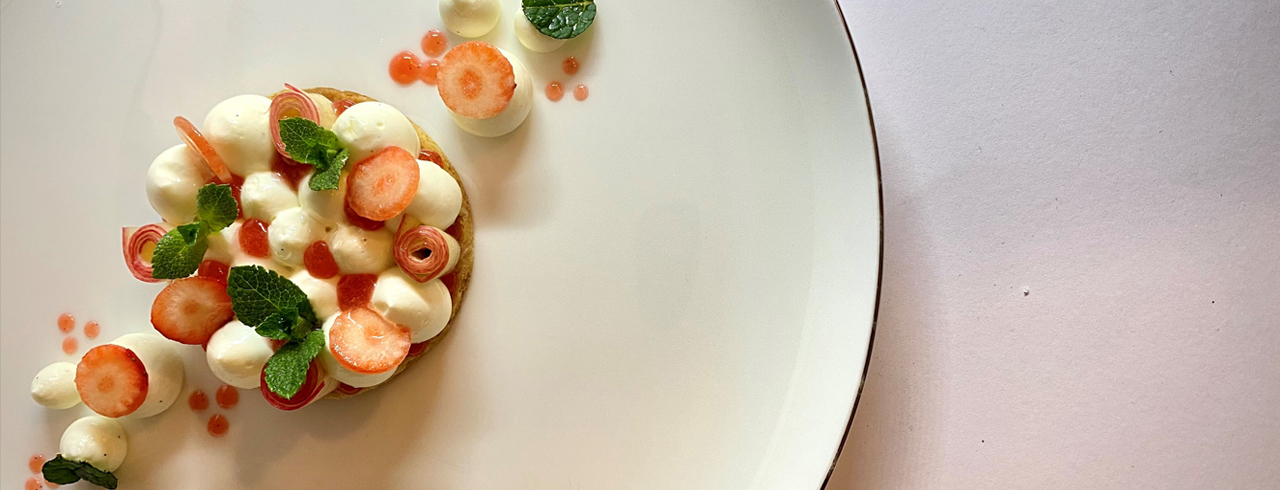 Dopo che la mousse si è raffreddata, versarla in un sac à poche.Una parte del rabarbaro può essere utilizzata come decorazione: a tal fine, tagliare il gambo a fette con un pelapatate e ricavarne dei nastri o dei cubetti.