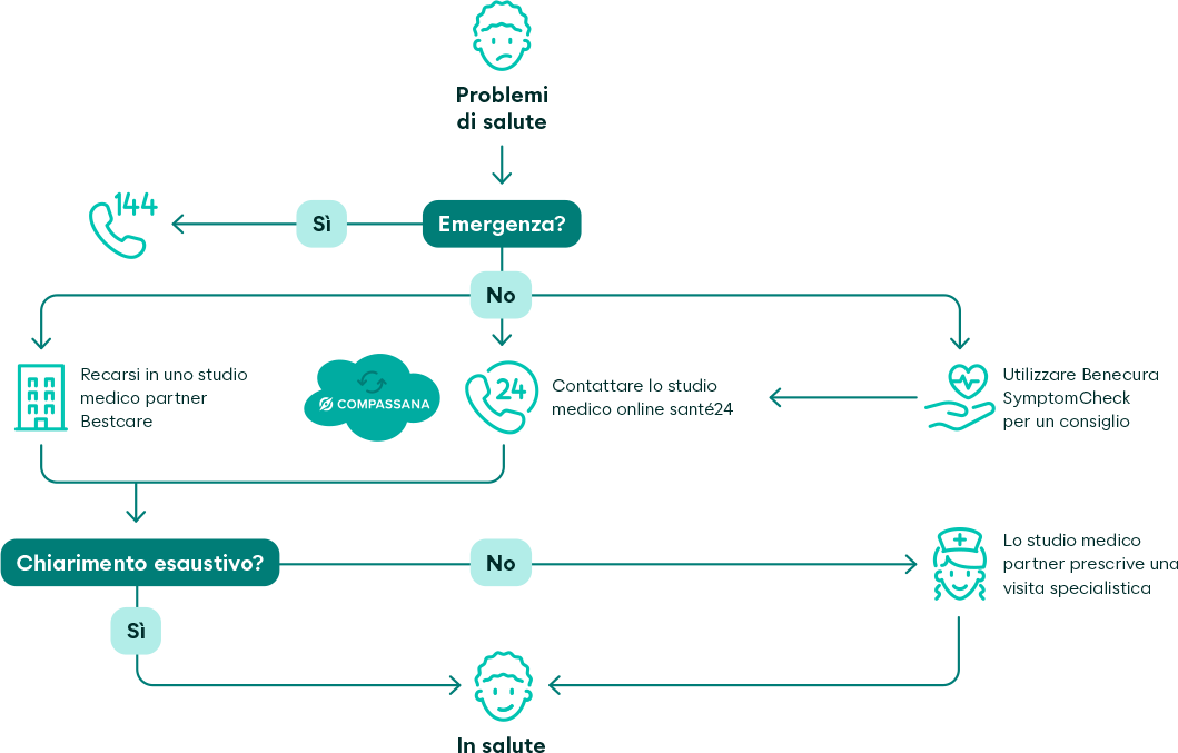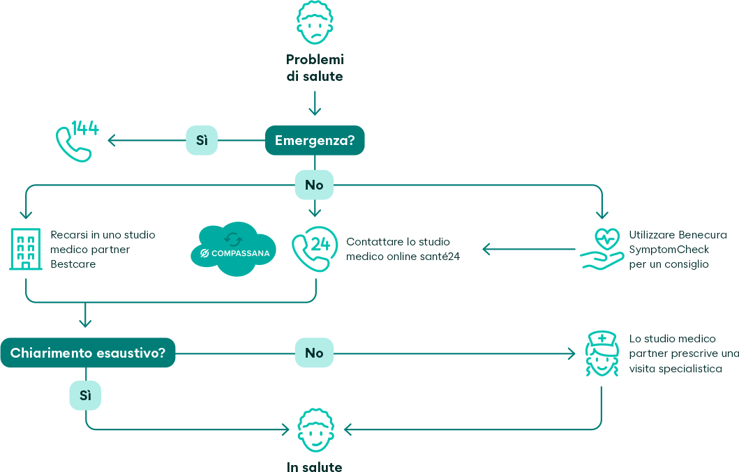 - Primo accertamento medico tempestivo con lo studio medico online santé24, uno studio medico partner Bestcare o il SymptomCheck di Benecura