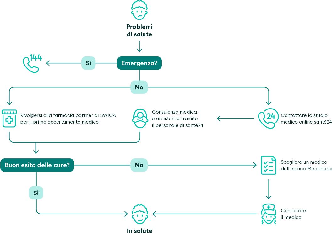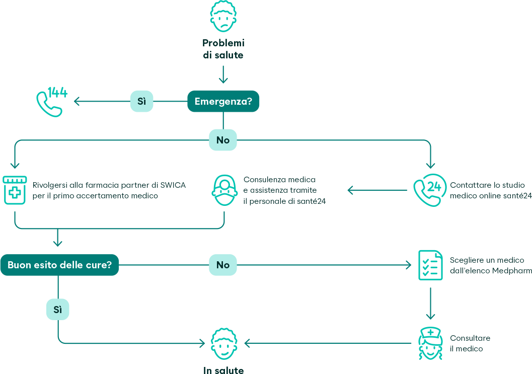 - Possibilità di un primo accertamento medico tempestivo presso una farmacia partner di SWICA senza preavviso o tramite lo studio medico online santé24