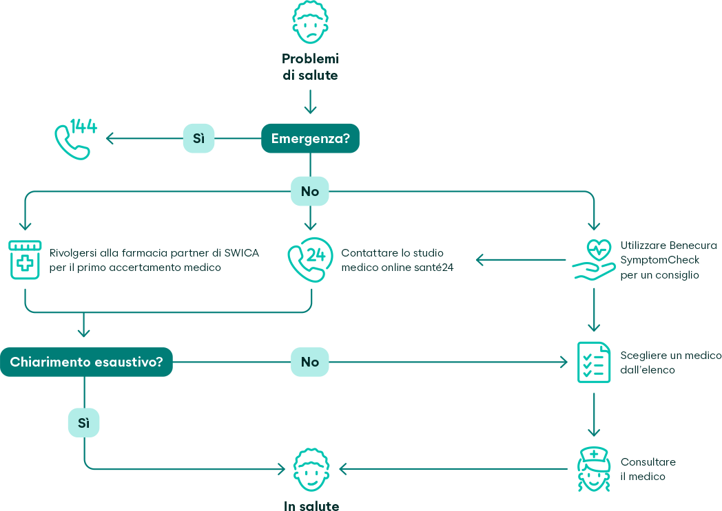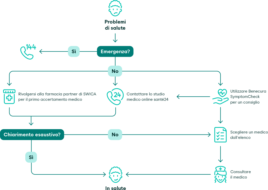 - Possibilità di un primo accertamento medico tempestivo con il SymptomCheck di Benecura, la consulenza dello studio medico online santé24 o una farmacia partner di SWICA.