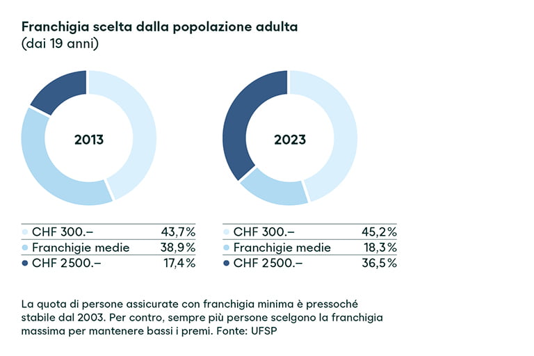 Per contenere l’aumento dei premi dell’assicurazione malattia si possono adottare alcune misure. Quella più efficace è l’aumento della franchigia, ovvero l’importo che occorre sborsare ogni anno di tasca propria prima che intervenga l’assicurazione di base. Più alta è la franchigia, più basso è il premio. Le persone assicurate in Svizzera possono scegliere tra sei scaglioni, dalla franchigia minima di 300 franchi a quella massima di 2500 franchi.