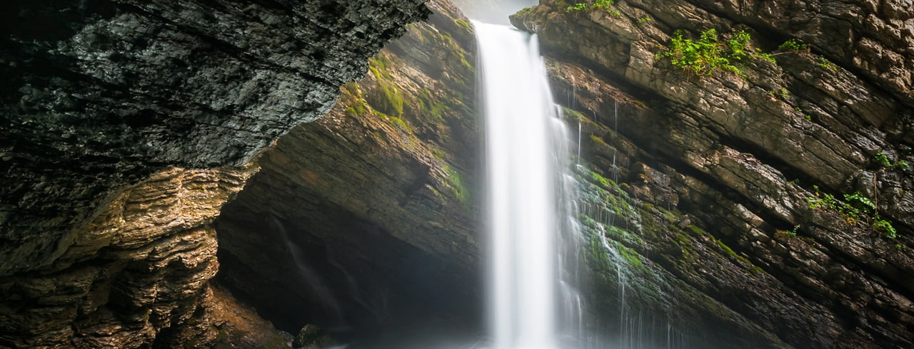 Mi sono innamorata della cascata Berglistüber nel Glarnerland. Lì il torrente Fätschbach si è scavato un letto nella pietra calcarea risalente a milioni di anni fa, per poi gettarsi a capofitto su un’imponente parete rocciosa in un bacino d’acqua blu intenso. E la cosa più bella è che si può passare dietro la cascata.
