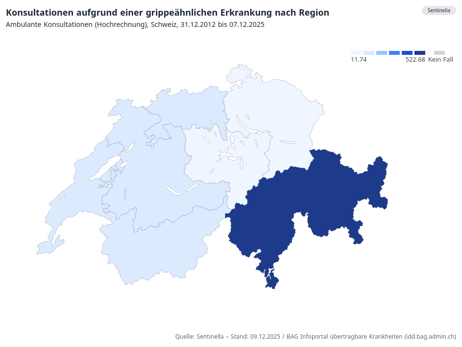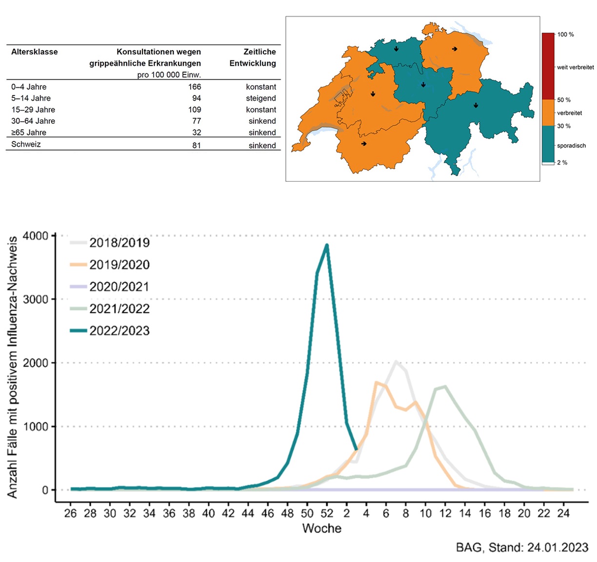 In base a un’estrapolazione rapportata all’intera popolazione svizzera, nell’ultima settimana sono state registrate 38 consultazioni mediche per 100 000 abitanti per sospetta influenza. Rispetto alla scorsa settimana, il tasso di consultazioni è leggermente aumentato. Il tasso medio di positività all’influenza su una media di tre settimane è del 3,5 per cento (settimana precedente: 2,5 per cento).