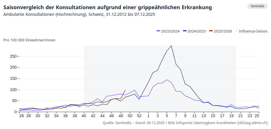 In base a un’estrapolazione rapportata all’intera popolazione svizzera, nell’ultima settimana sono state registrate 62 consultazioni mediche per 100 000 abitanti per sospetta influenza. Rispetto alla scorsa settimana, il tasso di consultazioni è quindi sceso. Il tasso medio di positività all’influenza su una media di tre settimane è del 26,4 per cento (settimana precedente: 18,1 per cento).